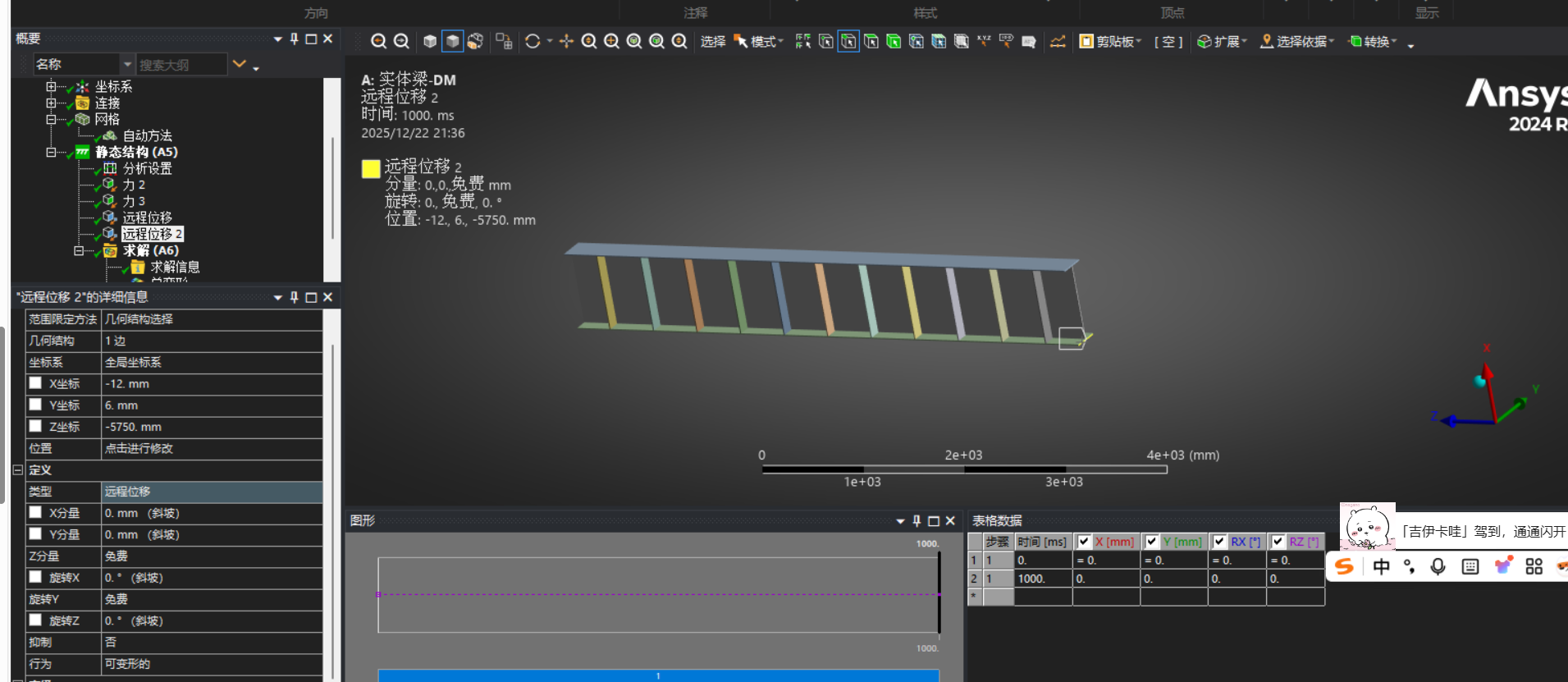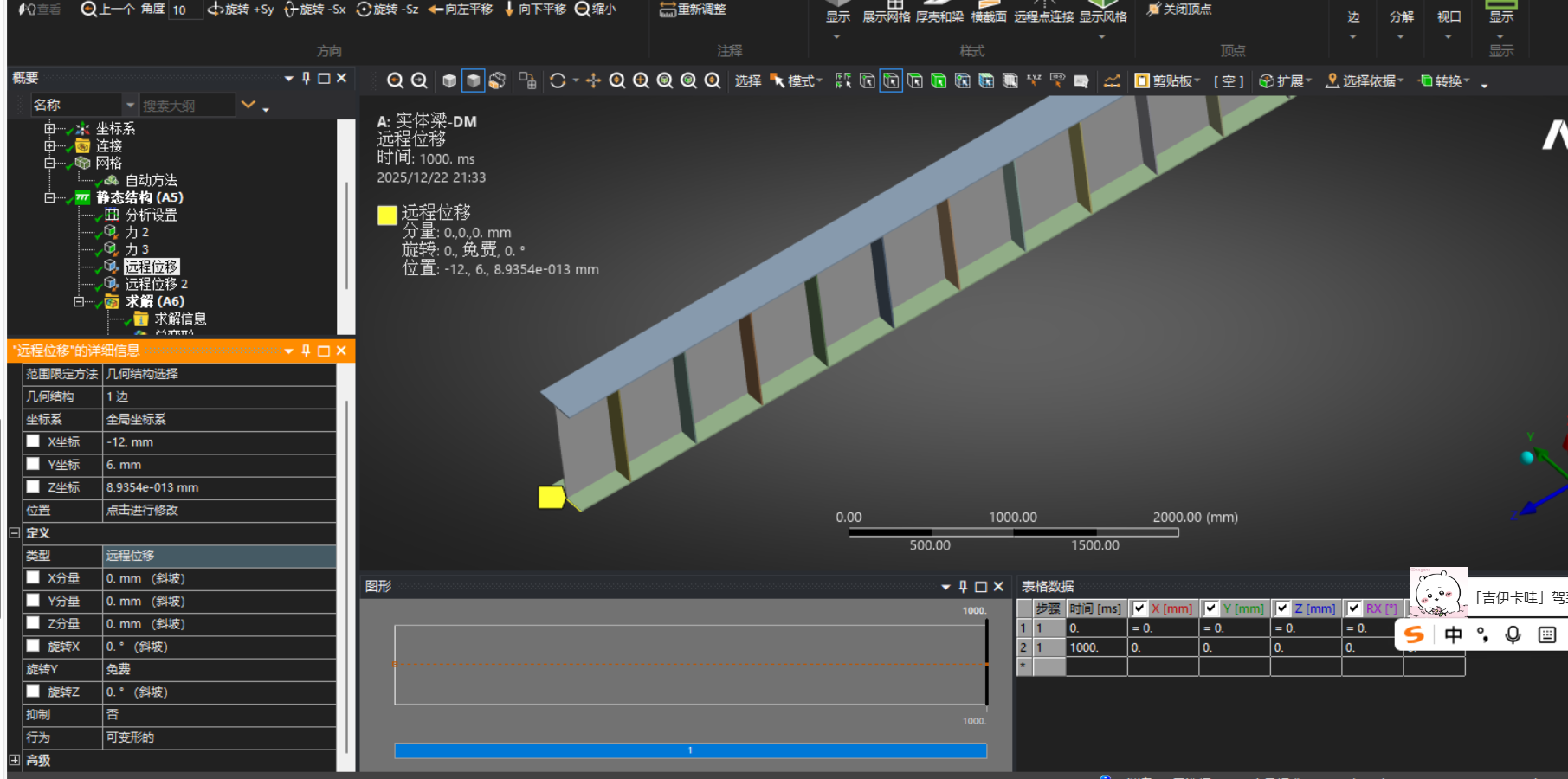 3.施加约束,采用远程位移方法加载,左端约束弯曲外其他五个自由度,右端不约束轴向位移和弯曲,其余自由度均进行约束。