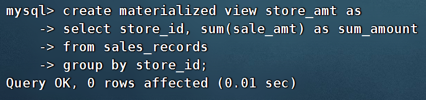 如果用户经常需要分析不同门店的销售量,则可以为 sales_records 表创建一个物化视图,该视图以售卖门店分组,并对相同售卖门店的销售额进行求和。创建语句如下: