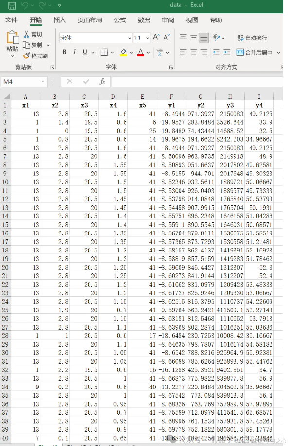 3.data为数据集,5个输入特征,4个输出变量,NSGAII算法寻极值,求出极值时(max y1; min y2;min y3;min y4)的自变量x1,x2,x3,x4,x5。