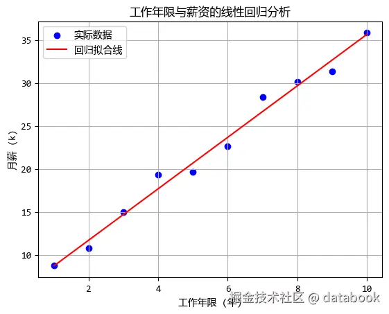 print("解读:起薪约 {:.2f}k,每年约涨 {:.2f}k".format(model.intercept_[0], model.coef_[0][0]))