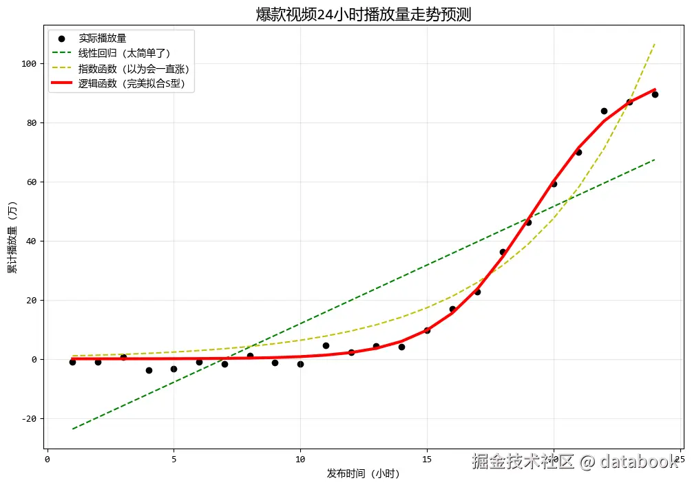 - 黄线(指数):在视频爆发初期(前10小时)拟合得很好,但它会预测24小时后播放量破亿,这显然不符合实际(因为受众是有限的)。