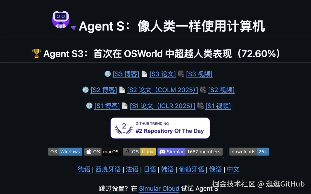 这个 Agent S 是目前比较前沿的开源 GUI 智能体框架。S3 是首个在 OSWorld 上超越人类水平的模型,取得了得分 72.60%。