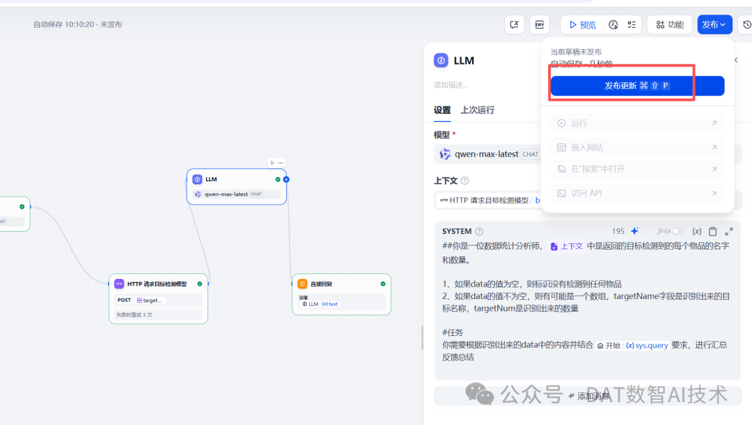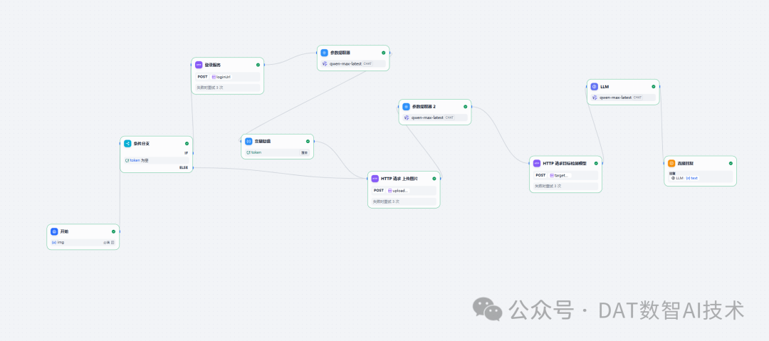 这里用到了2个核心的http节点,第一个是上传图片,第二个是调用模型进行检测,最后通过llm节点进行汇总