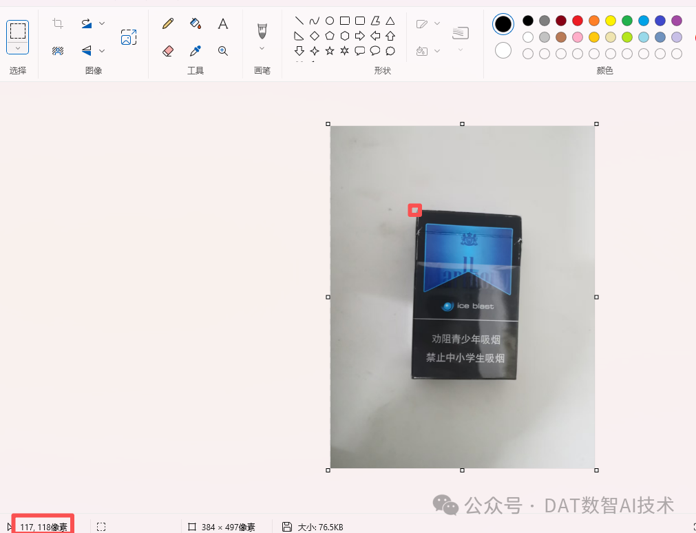 3、通过电脑的画图工具打开图片就能得到目标物品在图片中的X轴、Y轴和宽度信息