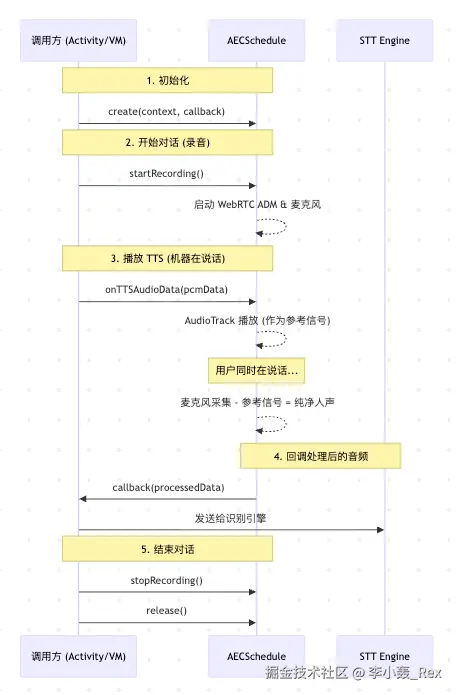 在我原有的设计里,TTS 播报走的是系统自带播放器,录音又来自 Android 系统原生的 AudioRecord,这是两条并行没有交集的数据处理线。如果继续保持原有设计,根本不可能实现效果,于是我参考 WebRTC 的设计。