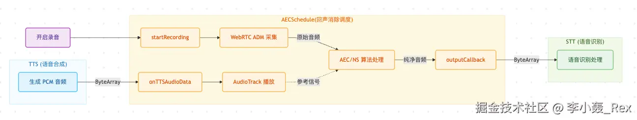 - 蓝色泳道 (TTS) : 负责产生声音。数据进入 AECSchedule 后,不仅是为了让用户听到(通过扬声器),更是为了告诉 AEC 算法"这是我们自己发出的声音,请不要把它当成用户说的话"。