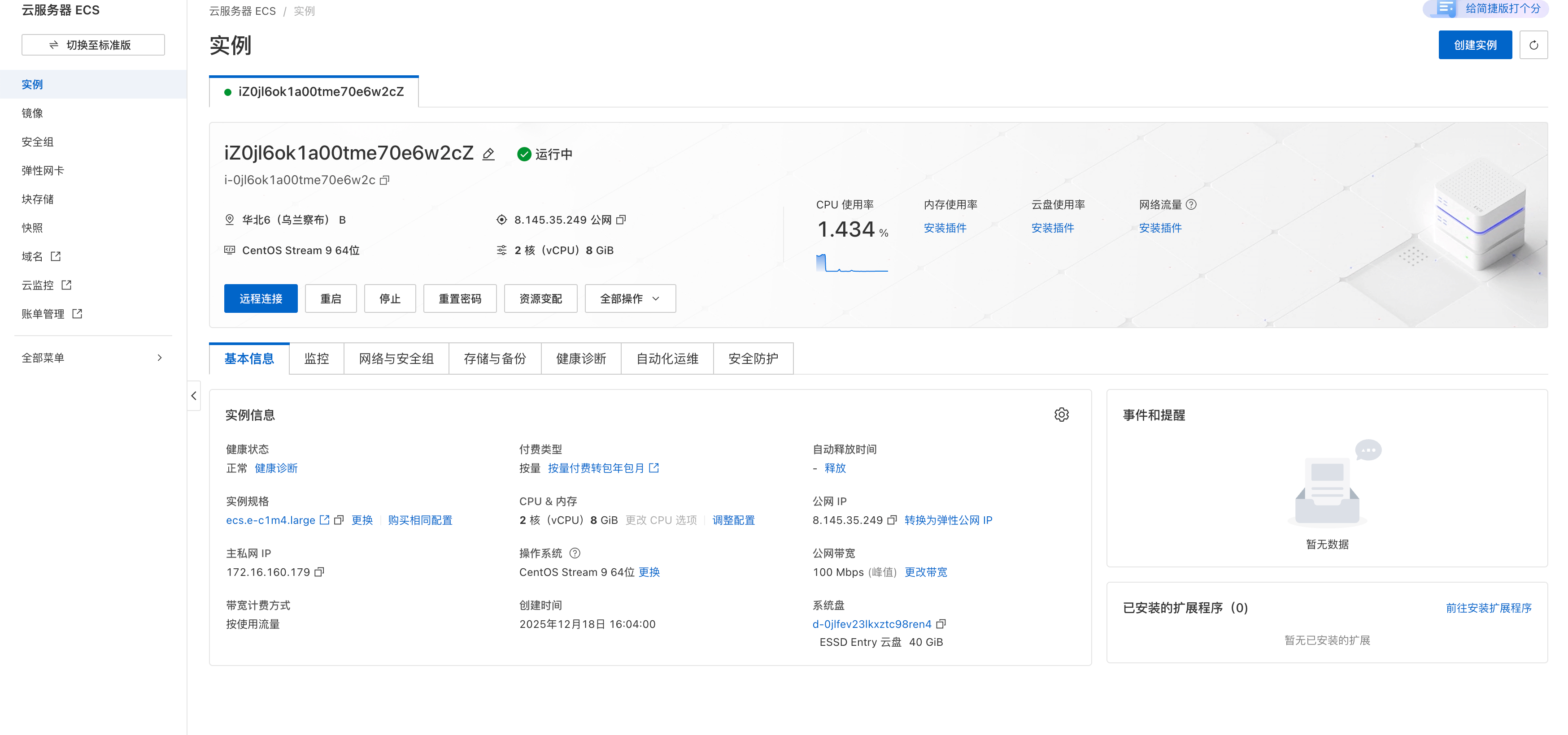 1)个人选择的是阿里云服务器,2核4G的配置(按量付费)