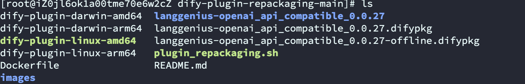 4)执行以下命令 ,会将langgenius-openai_api_compatible_0.0.27.difypkg 重新打包成langgenius-openai_api_compatible_0.0.27-offline.difypkg包,重新打包后的插件会比原插件大