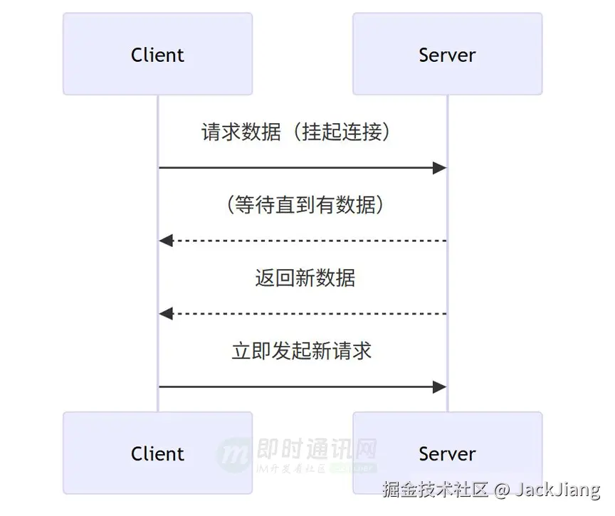 原理:使用长连接请求数据。 客户端发送一个请求,服务器会保持这个连接打开(长连接),直到有新数据可用或超时。一旦客户端收到响应,会立即发起下一个请求。