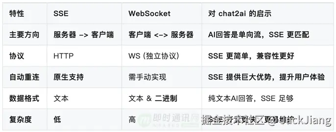 虽然 SSE 是主流选择,但在 chat2ai 应用变得非常复杂时,WebSocket 可能会成为更好的选择。