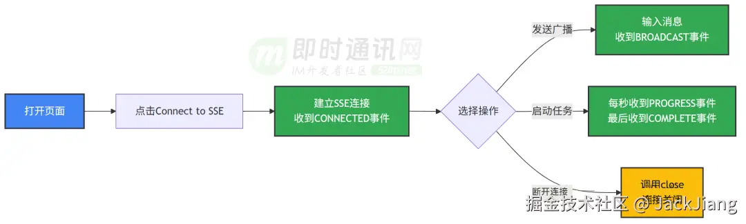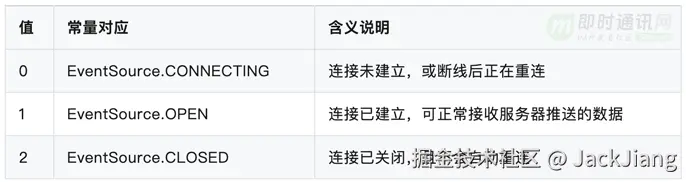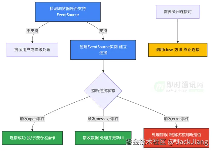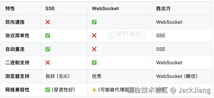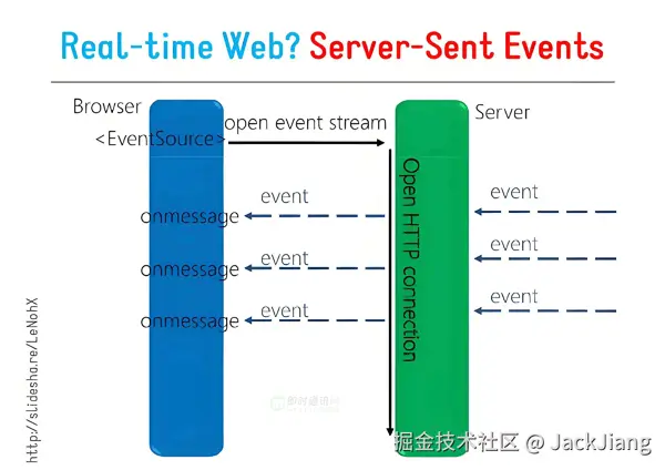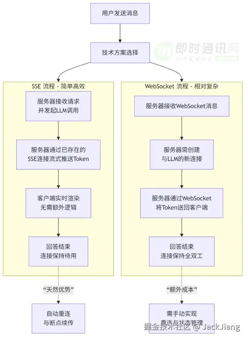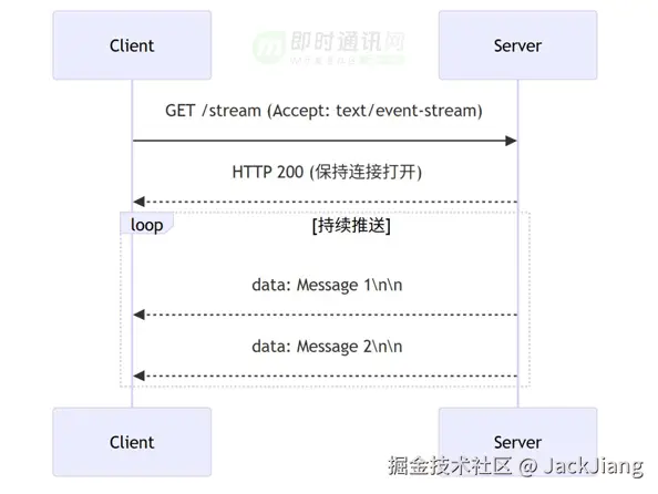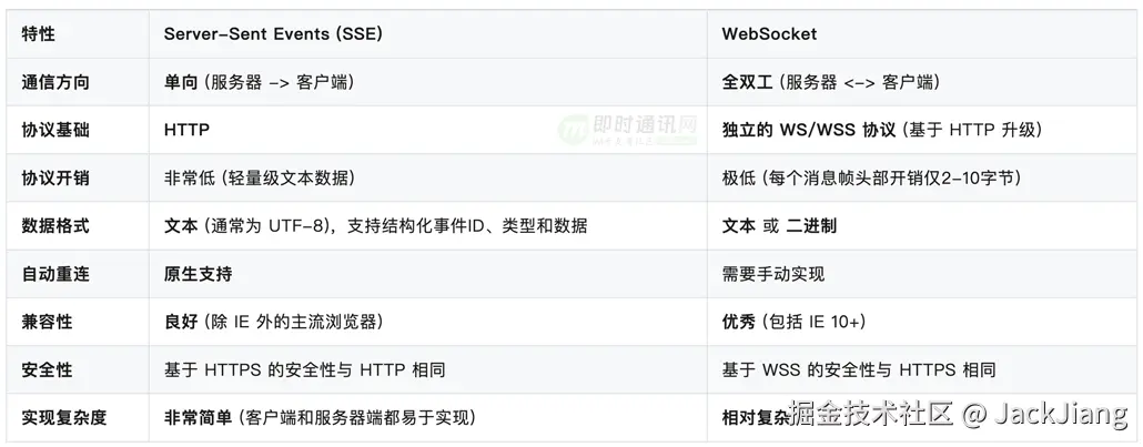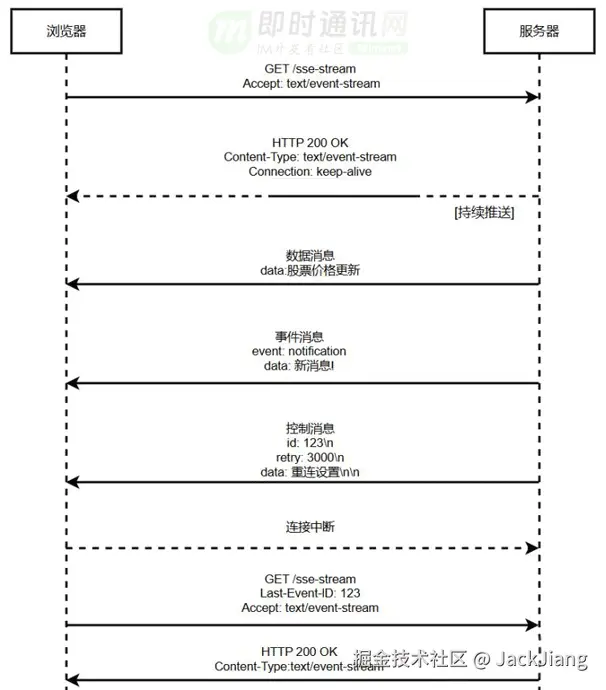 0\] [EventSource API Docs](https://link.juejin.cn?target=https%3A%2F%2Fdeveloper.mozilla.org%2Fzh-CN%2Fdocs%2FWeb%2FAPI%2FEventSource "https://developer.mozilla.org/zh-CN/docs/Web/API/EventSource") \[1\] [Web端即时通讯技术盘点:短轮询、Comet、Websocket、SSE](https://link.juejin.cn?target=http%3A%2F%2Fwww.52im.net%2Fthread-336-1-1.html "http://www.52im.net/thread-336-1-1.html") \[2\] [SSE技术详解:一种全新的HTML5服务器推送事件技术](https://link.juejin.cn?target=http%3A%2F%2Fwww.52im.net%2Fthread-335-1-1.html "http://www.52im.net/thread-335-1-1.html") \[3\] [使用WebSocket和SSE技术实现Web端消息推送](https://link.juejin.cn?target=http%3A%2F%2Fwww.52im.net%2Fthread-907-1-1.html "http://www.52im.net/thread-907-1-1.html") \[4\] [详解Web端通信方式的演进:从Ajax、JSONP 到 SSE、Websocket](https://link.juejin.cn?target=http%3A%2F%2Fwww.52im.net%2Fthread-1038-1-1.html "http://www.52im.net/thread-1038-1-1.html") \[5\] [使用WebSocket和SSE技术实现Web端消息推送](https://link.juejin.cn?target=http%3A%2F%2Fwww.52im.net%2Fthread-907-1-1.html "http://www.52im.net/thread-907-1-1.html") \[6\] [一文读懂前端技术演进:盘点Web前端20年的技术变迁史](https://link.juejin.cn?target=http%3A%2F%2Fwww.52im.net%2Fthread-2719-1-1.html "http://www.52im.net/thread-2719-1-1.html") \[7\] [WebSocket从入门到精通,半小时就够!](https://link.juejin.cn?target=http%3A%2F%2Fwww.52im.net%2Fthread-3134-1-1.html "http://www.52im.net/thread-3134-1-1.html") \[8\] [网页端IM通信技术快速入门:短轮询、长轮询、SSE、WebSocket](https://link.juejin.cn?target=http%3A%2F%2Fwww.52im.net%2Fthread-3555-1-1.html "http://www.52im.net/thread-3555-1-1.html") \[9\] [搞懂现代Web端即时通讯技术一文就够:WebSocket、socket.io、SSE](https://link.juejin.cn?target=http%3A%2F%2Fwww.52im.net%2Fthread-3695-1-1.html "http://www.52im.net/thread-3695-1-1.html") \[10\] [大模型时代多模型AI网关的架构设计与实现](https://link.juejin.cn?target=http%3A%2F%2Fwww.52im.net%2Fthread-4831-1-1.html "http://www.52im.net/thread-4831-1-1.html") \[11\] [全民AI时代,大模型客户端和服务端的实时通信到底用什么协议?](https://link.juejin.cn?target=http%3A%2F%2Fwww.52im.net%2Fthread-4797-1-1.html "http://www.52im.net/thread-4797-1-1.html") \[12\] [通俗易懂:AI大模型基于SSE的实时流式响应技术原理和实践示例](https://link.juejin.cn?target=http%3A%2F%2Fwww.52im.net%2Fthread-4856-1-1.html "http://www.52im.net/thread-4856-1-1.html") \[13\] [Web端实时通信技术SSE在携程机票业务中的实践应用](https://link.juejin.cn?target=http%3A%2F%2Fwww.52im.net%2Fthread-4832-1-1.html "http://www.52im.net/thread-4832-1-1.html") \[14\] [ChatGPT如何实现聊天一样的实时交互?快速读懂SSE实时"推"技术](https://link.juejin.cn?target=http%3A%2F%2Fwww.52im.net%2Fthread-4872-1-1.html "http://www.52im.net/thread-4872-1-1.html") (本文已同步发布于:[www.52im.net/thread-4885...](https://link.juejin.cn?target=http%3A%2F%2Fwww.52im.net%2Fthread-4885-1-1.html "http://www.52im.net/thread-4885-1-1.html"))