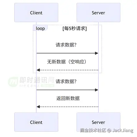 原理: 用短连接请求数据。客户端以固定的时间间隔(例如每秒一次)频繁地向服务器发送请求,询问是否有新数据。