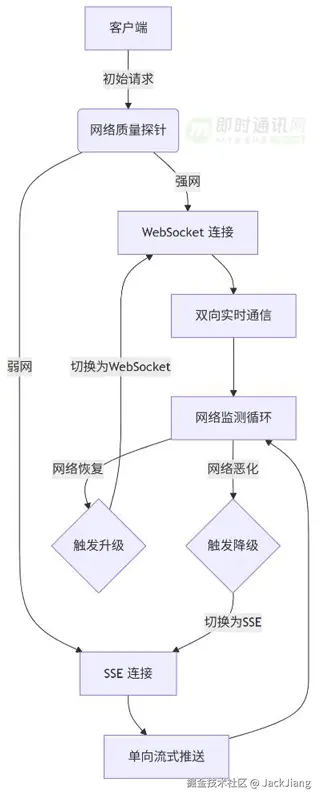 2)未来如果需要扩展:采用混合架构。如果应用未来需要加入上述 WebSocket 的适用功能(如实时语音),完全可以同时使用两种协议:使用 SSE 专门处理 AI 文本答案的流式推送。使用 WebSocket 专门处理 实时语音、实时协作等真正的双向通信功能。或者 强弱结合,自动切换。