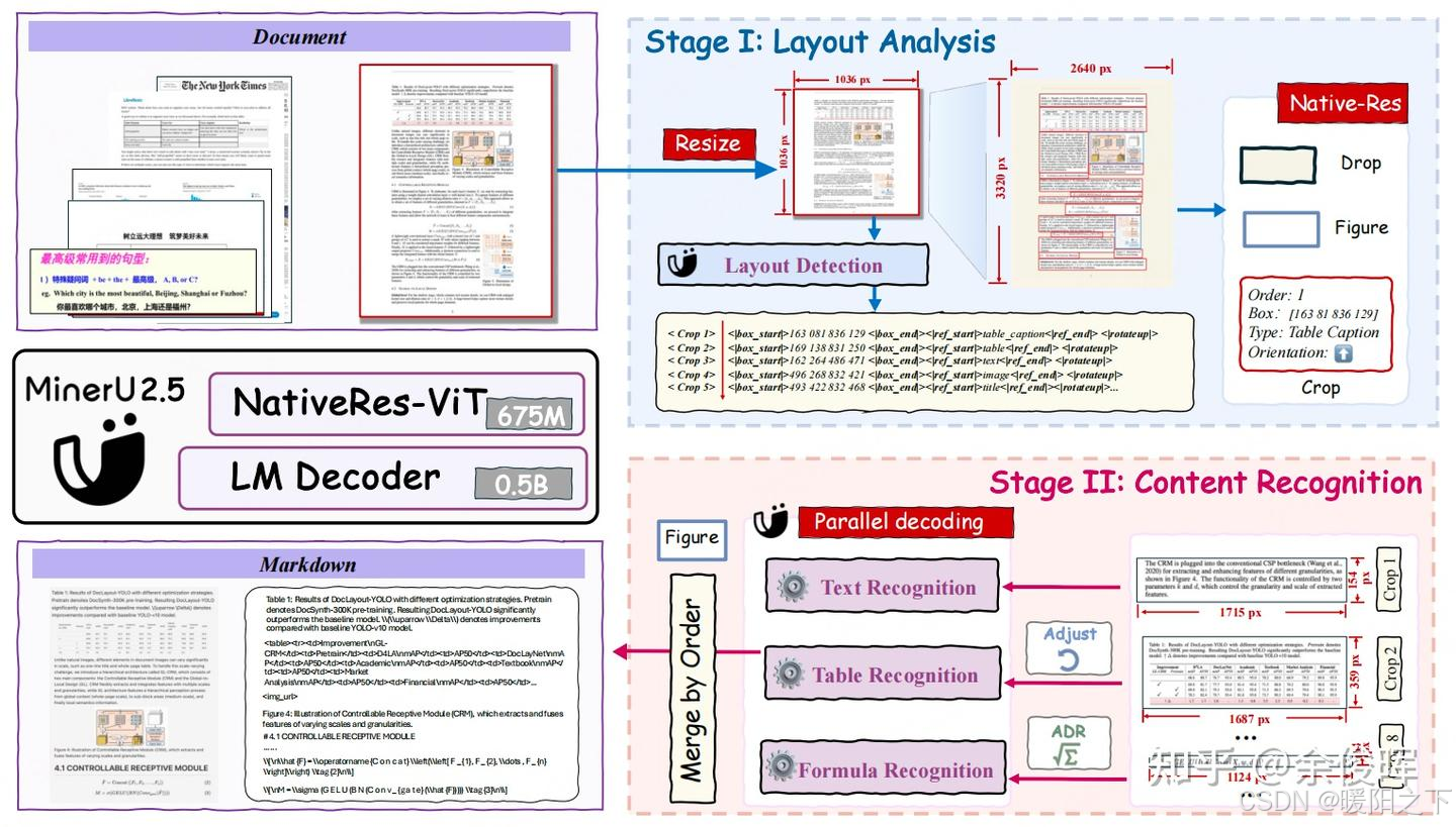 MinerU2.5 是专用于文档解析的轻量级(1.2B)视觉语言模型,其核心特点是通过两阶段解析策略平衡识别精度与计算效率: