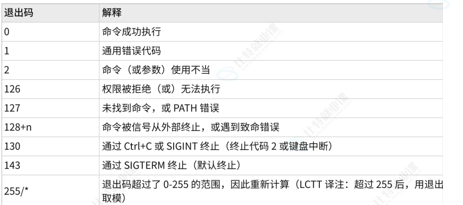 退出码(退出状态)可以告诉我们最后一次执行的命令的状态,在命令结束以后,我们可以知道命令是成功完成的还是以错误结束的,其基本思想是,程序返回退出代码0时表示执行成功,没有问题,代码是1或0以外的任何代码都视为不成功