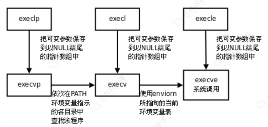 事实上,只有execve是真正的系统调用,其他的五个函数最终都会调用execve,所以execve在man手册第2节,其他函数在man手册第3节,这些函数之间的关系如下: