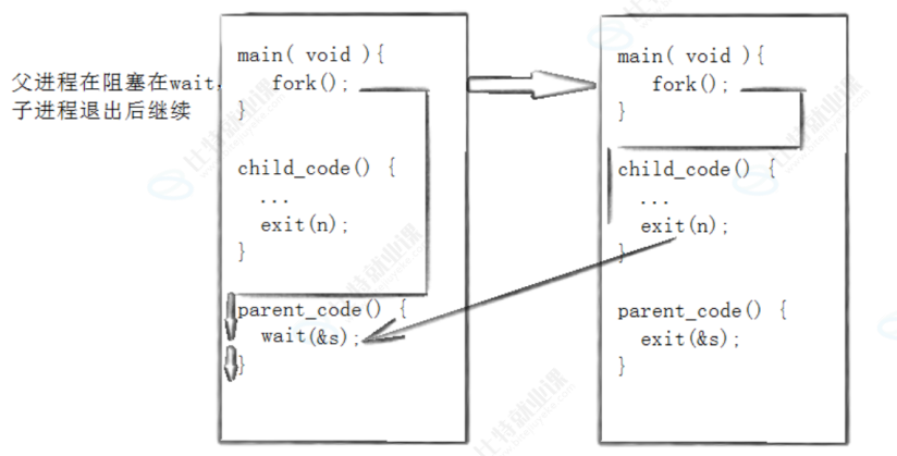父进程通过 fork 创建子进程后,在 parent_code 中调用 wait (&s) 阻塞等待,子进程执行 child_code 并 exit (n) 退出,其退出信息被打包存入 wait 的参数 s 中,父进程被唤醒后拿到 s(即 status)