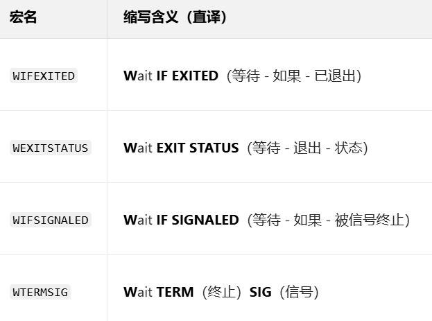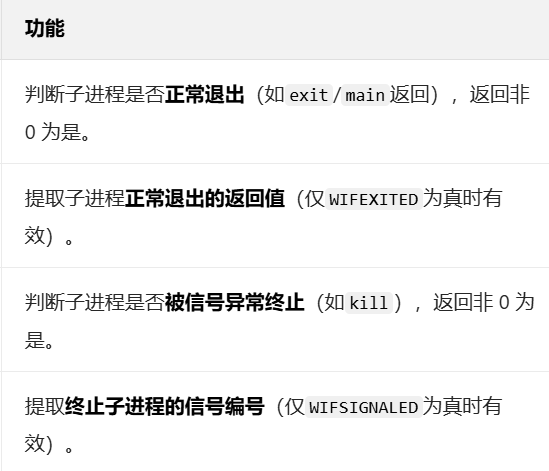 WIFEXITED(status):若为正常终止进程返回的状态,则为真(查看进程是否正常退出)