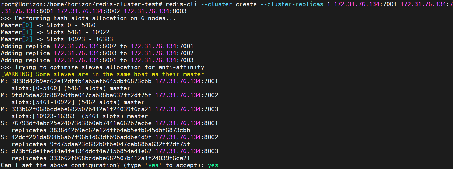 redis-cli --cluster create --cluster-replicas 1 192.168.150.101:7001 192.168.150.101:7002 192.168.150.101:7003 192.168.150.101:8001 192.168.150.101:8002 192.168.150.101:8003