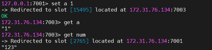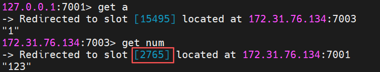 到了 7003 后,执行 get num 时,对 num 做 hash 运算,对 16384 取余,得到的结果是 2765,因此需要切换到 7001 节点。