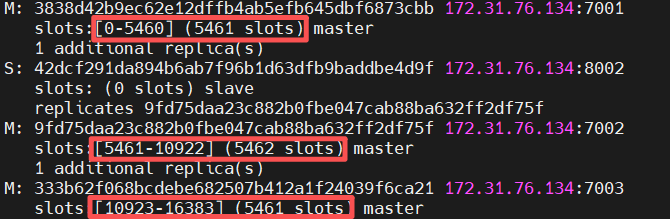 --replicas 1 或者 --cluster-replicas 1 :指定集群中每个 master 的副本个数为 1,此时"节点总数 ÷ (replicas + 1) "得到的就是 master 的数量。因此节点列表中的前 n 个就是 master,其它节点都是 slave 节点,随机分配到不同 master