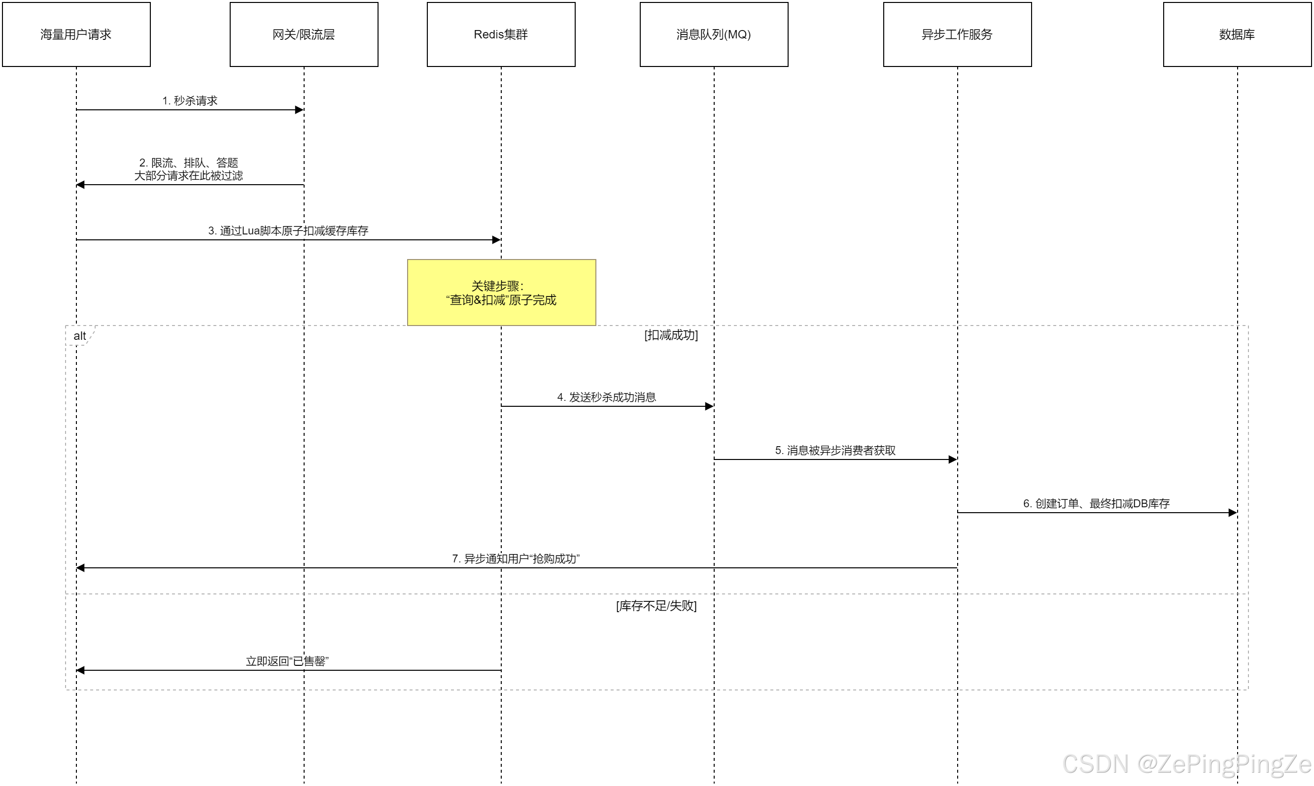 - 核心挑战 :在毫秒级时间内,并发请求量远超数据库处理能力,导致库存超卖、系统崩溃、用户体验差。