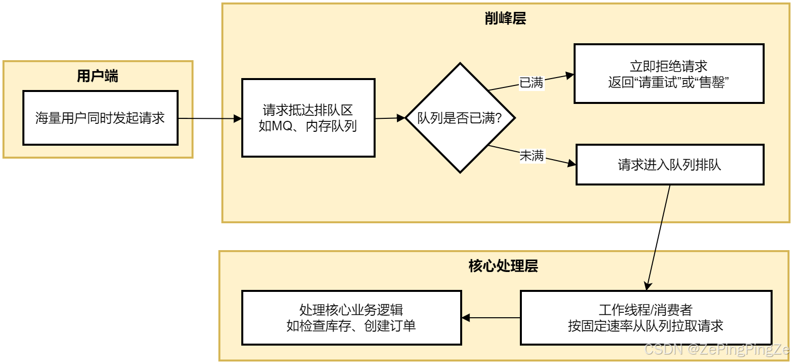 ✅ 关键点 :在秒杀场景中,流量削峰 的核心不是 "减少请求",而是 "让有效请求能被处理"。无效请求(库存不足时的请求)被过滤掉,有效请求(能买到商品的请求)被平稳处理。