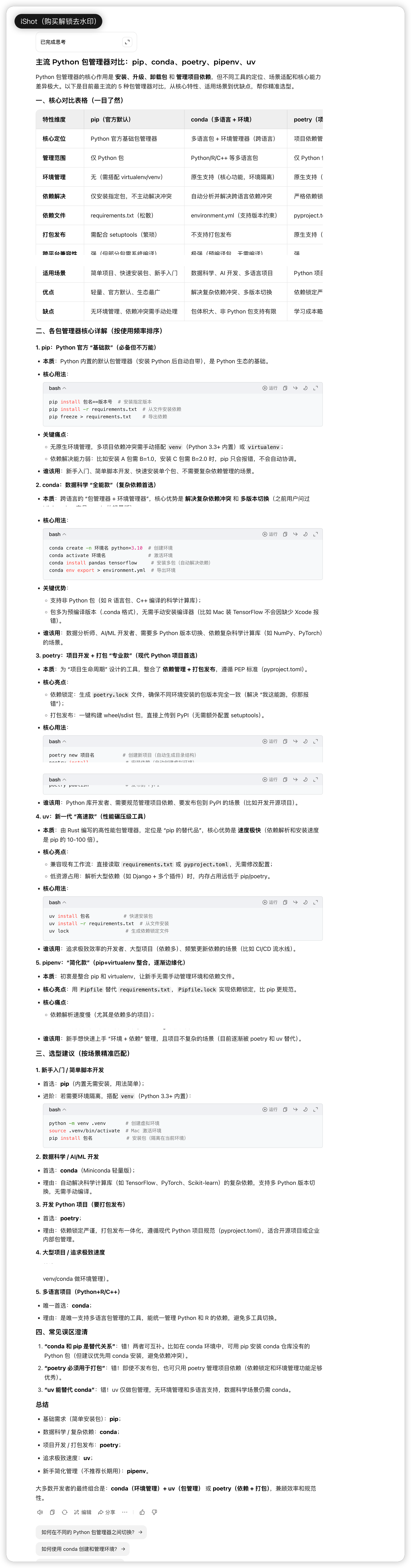 | 缺点 | 无环境管理、依赖冲突需手动处理 | 包体积大、非 Python 包支持有限 | 学习成本略高、部分老包兼容差 | 依赖解析速度慢、维护力度下降 | 无环境管理、功能单一(仅包管理) |