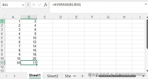 上述代码将在A11单元格插入=SUM(A1:A10),并在B11单元格插入=AVERAGE(B1:B10)。插入结果: