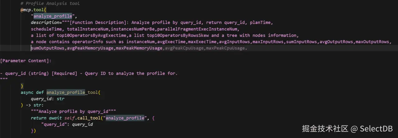 在本场景中,团队主要使用 Apache Doris 的 MCP,并进行了大量优化,以满足实际需求。例如,增加了用于获取 Profile 的工具、提取 Task 信息的工具及分析审计记录的工具。同时,还将这些工具与自研的 Profile 可视化工具集成到 MCP 中,使其可在 MCP 体系内被调用。下图展示了 MCP 工具扩展的部分示例: