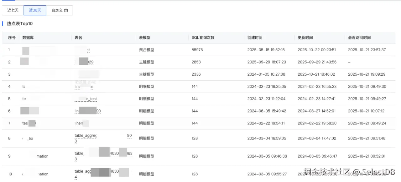 - 表级健康诊断:以表健康度为例,体现了 AI 基于这些信息生成的诊断结果,包含分区健康度、tablet 健康度、版本健康度、副本健康度以及 segment 健康度。基于上述各项指标,汇总计算出该表的整体健康度。