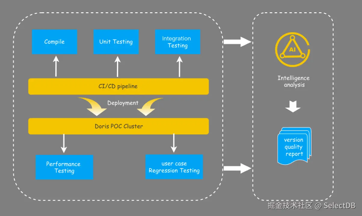 我们建立了一套自动化质量评估体系,主要用于解决前文提到的版本数量多、发版风险高等问题,避免新版本对生产环境造成影响。该体系的主要思想就是在版本发布之后通过自动化流程把 UT、集成测试、性能测试、用户核心 case 都回归测试,再由 AI 对这些结果进行分析,输出诊断结论及相应的优化建议。