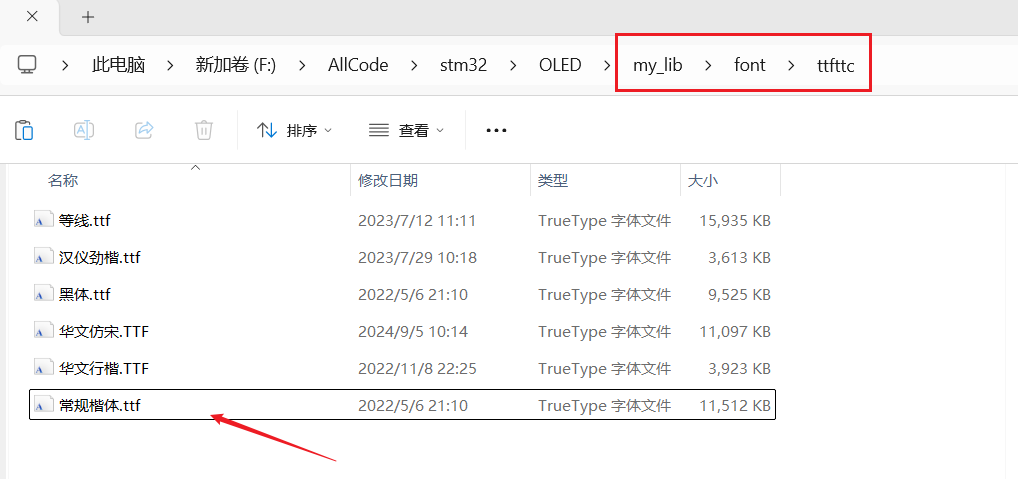 例如我拿我电脑的"常规楷体"为例,复制到咱们的工程文件夹中的my_lib->font->ttfttc文件夹当中。
