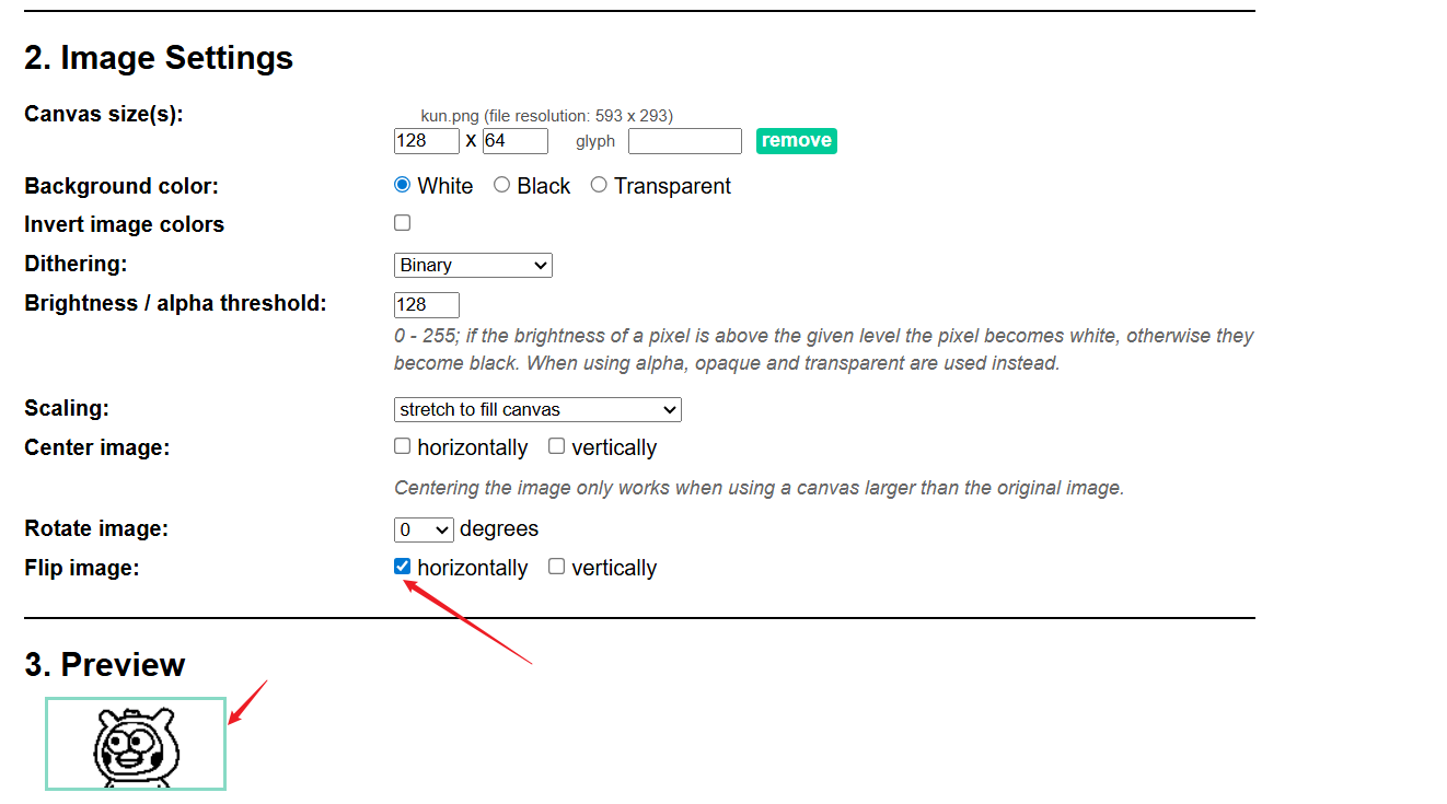 往下拉,输入画布尺寸,我们的显示屏是128x64像素的,然后让图片自适应画布,然后在下面就可以看到我们生成的图片预览了。