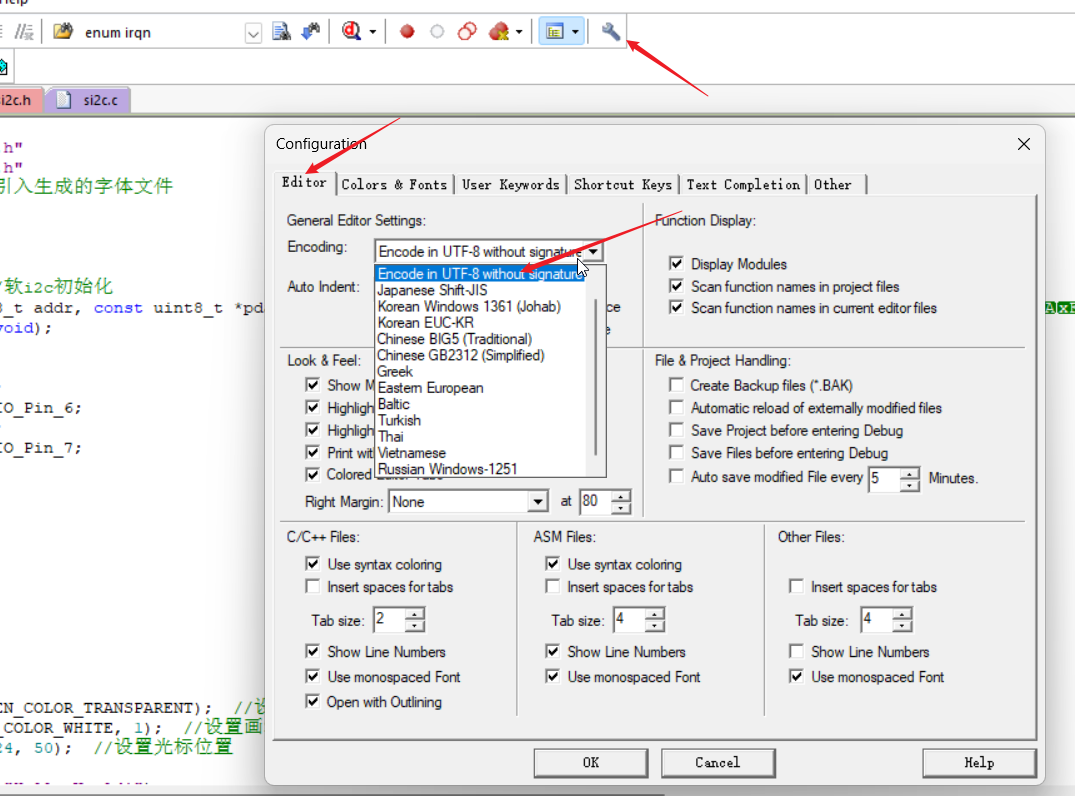 注意:如果没有正常显示,需要你把编码类型改成utf-8的格式,点击keil软件右上角的扳手更改,重新编译烧录并按下复位键即可。