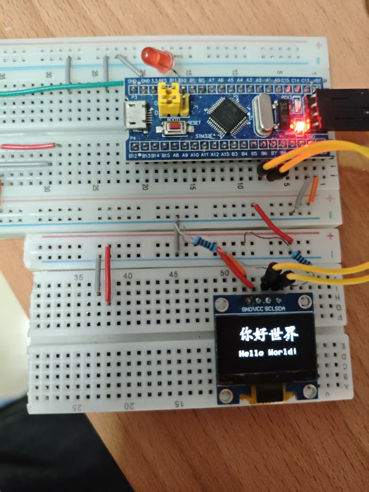 编译并下载,按下复位键,可以看到OLED显示屏上显示"Hello World !"字样。