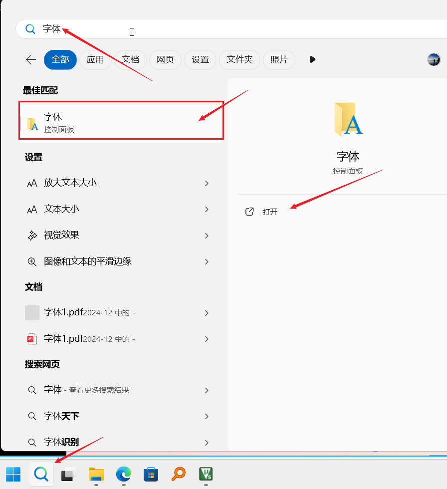 关于中文字体的显示这就比较麻烦了,咱们需要用到取模软件帮我们把中文字体进行编码后才能进行显示。首先我们以自己电脑中已有的字体为例,在电脑搜索框或者控制面板找到"字体"。