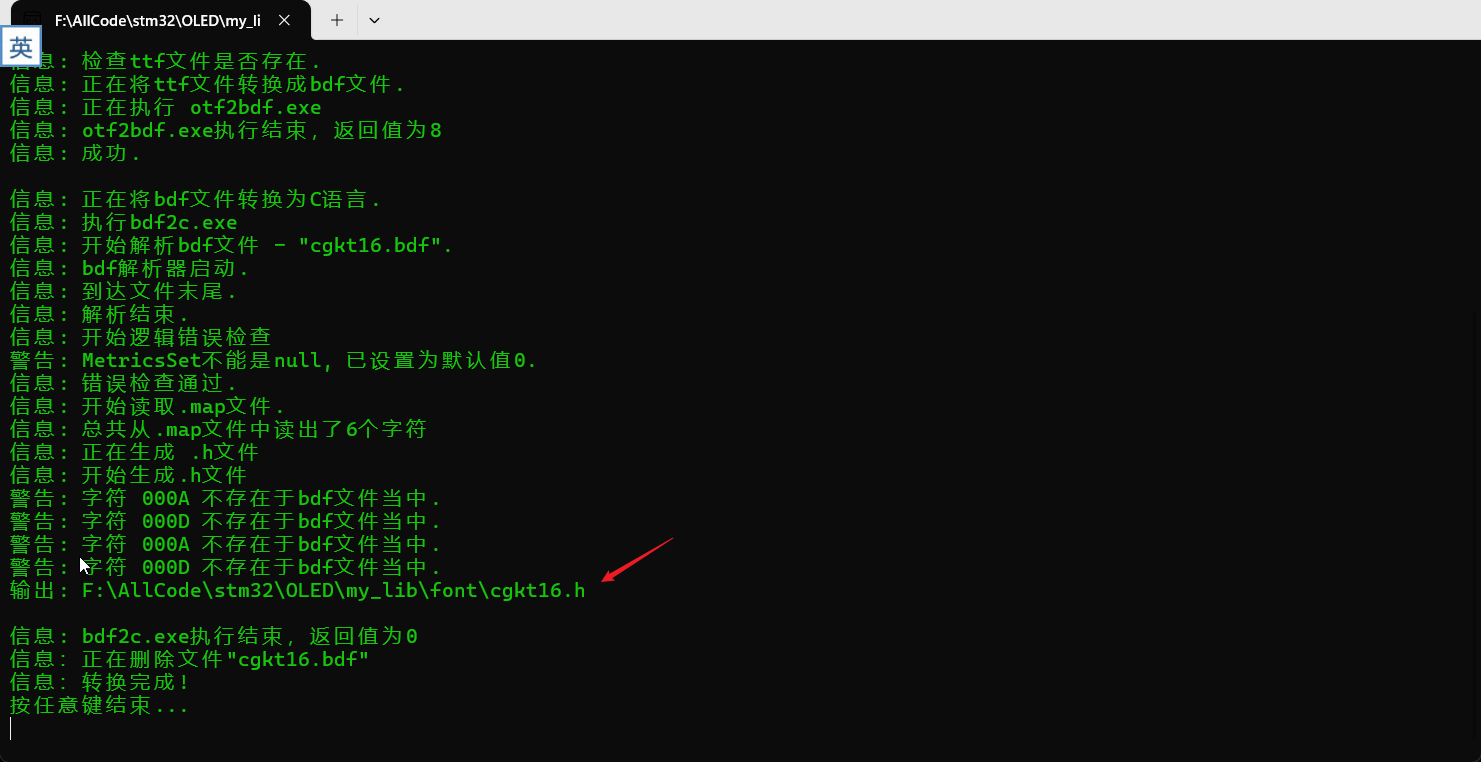 这里咱们需要输入三个信息,分别是:字体文件名、字号和要生成的字体名称(自定义,简单点好),比如我这里刚刚用的常规楷体,那么我就输入"常规楷体 16 cgkt16"每个信息之间记得加空格,然后回车等待生成。生成成功: