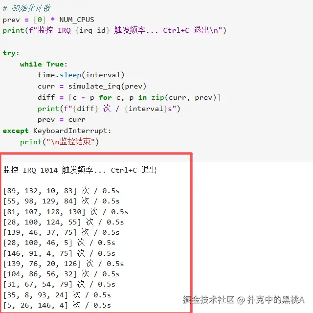 print(f"监控 IRQ {irq_id} 触发频率... Ctrl+C 退出")
