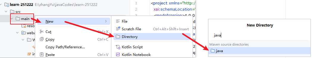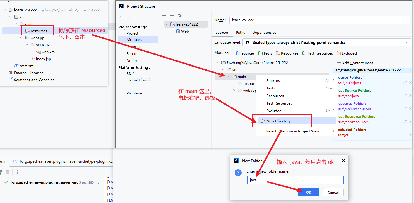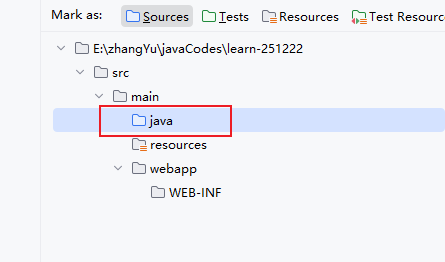 把包结构打开,双击 resources 目录,在中央的包结构 main这里,右键 新建文件夹,命名为java,ok。