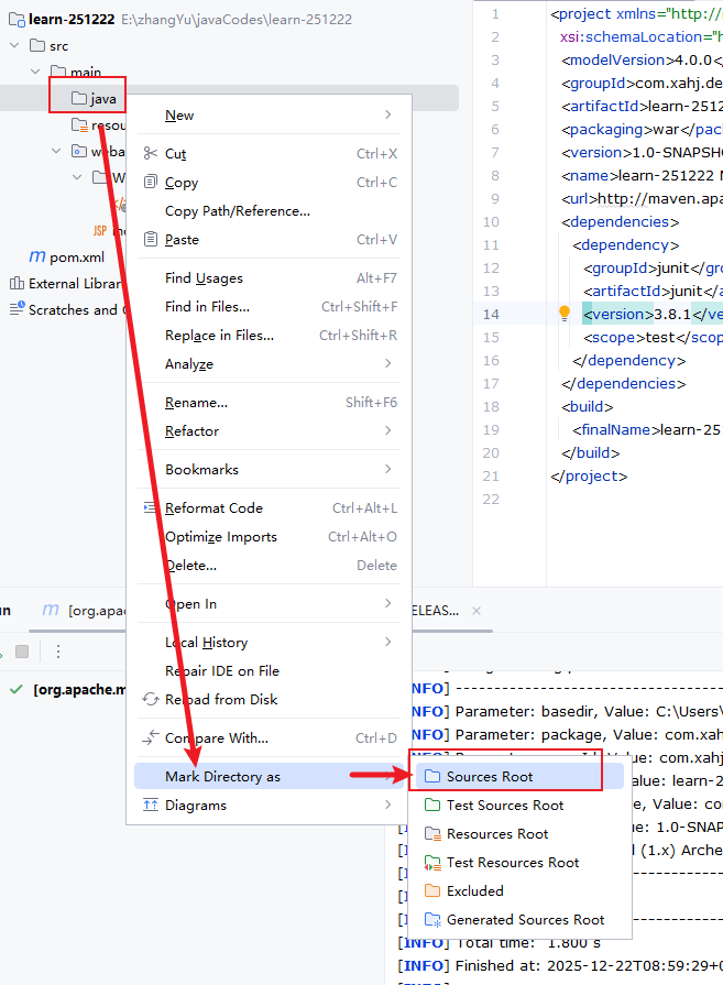 直接在 main文件包这里,右键新建文件夹,2025版本的idea会有提示,已经有是Sources的java文件夹了,直接选中就行。