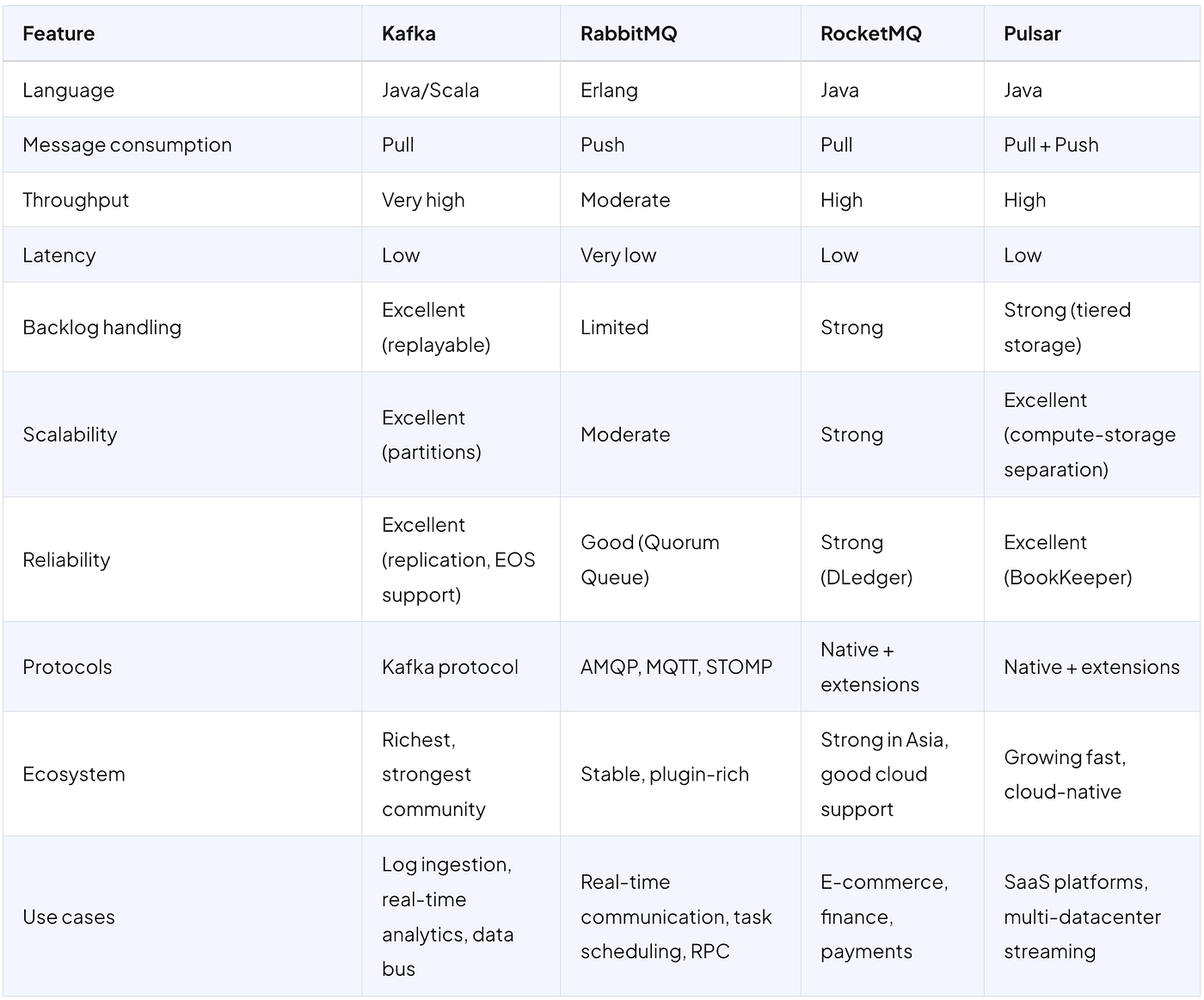 - 扩展性与运维:云原生、多租户 → Pulsar;简单集群 → RabbitMQ;大规模水平扩展 → Kafka/RocketMQ。
