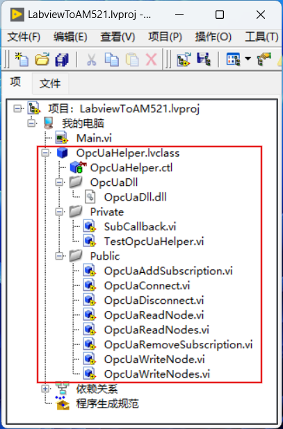 新建OpcUaHelper类如下,在类中新建多个子vi,该类用于集成OpcUa的通信。