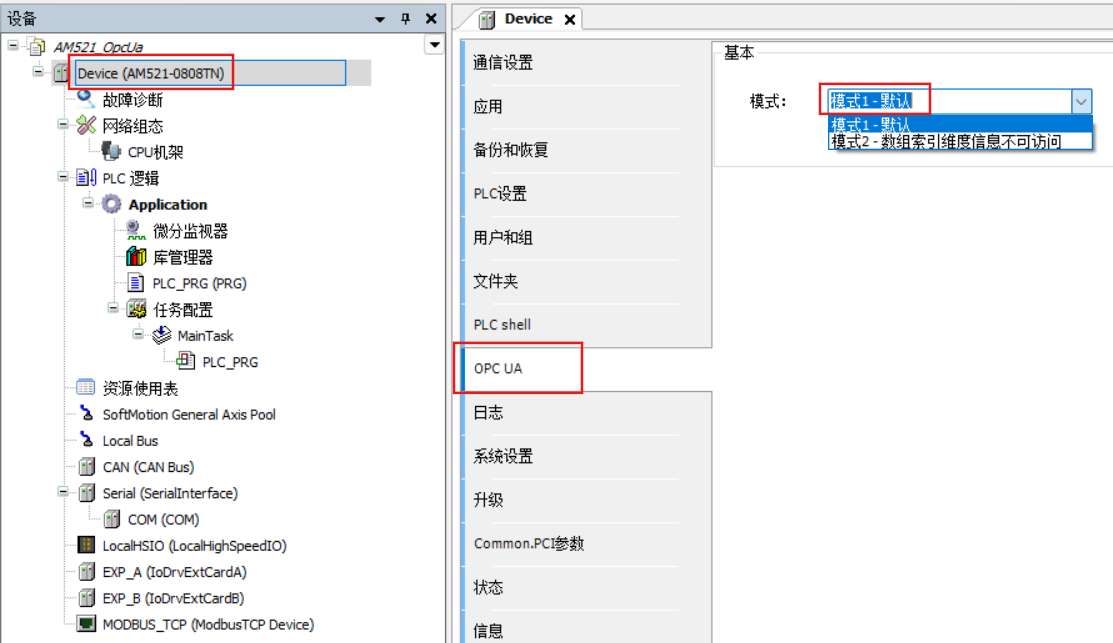 双击Device,鼠标左击OPC UA,选择模式1。