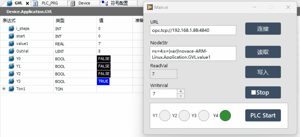本节内容执行结果如下,连接后点击写入按钮可以将设定的值写入PLC中,点击读取可以读取写入的值,点击PLCStart,PLC中的程序运行,Y1-Y4依次点亮;