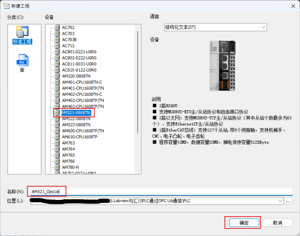 本次使用的时汇川的AM521,语言选择结构化文本,点击确定。
