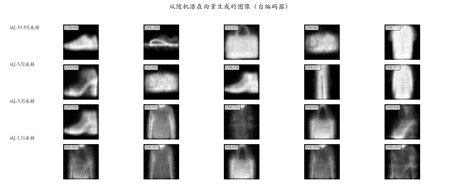 生成能力测试:从不同范围的潜在空间随机采样,测试自编码器的生成能力。