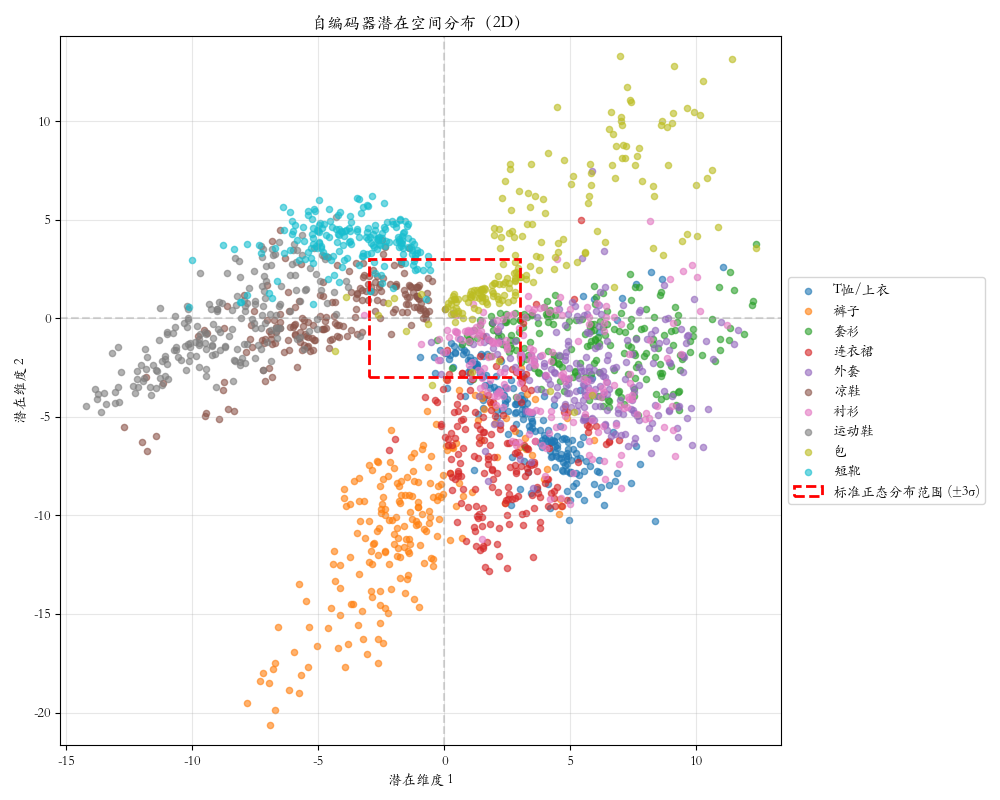 潜在空间的无序性:从图中可见,10类服装数据的潜在表示散布在横轴-15到10、纵轴-10到10的广阔范围内,远超红色虚线框标识的标准正态分布范围(±3σ)。