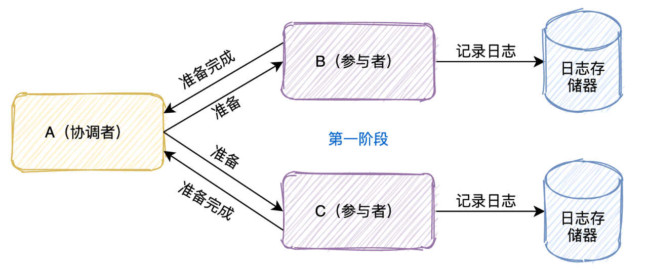 - **「发一个prepare命令」**给B和C节点这两个参与者