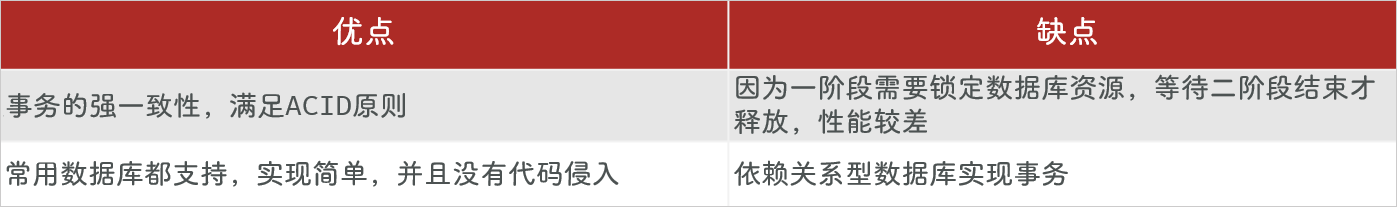 - 一阶段完成直接提交事务,释放数据库资源,性能比较好;